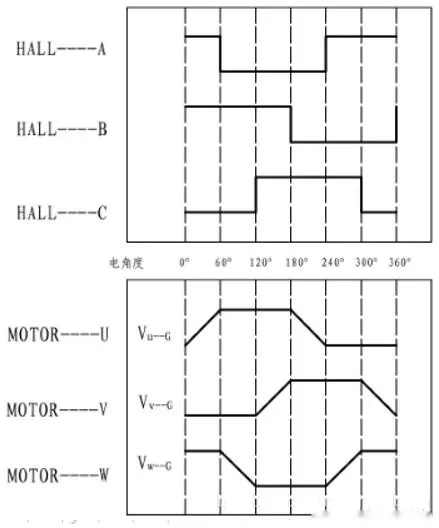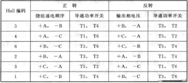 根據(jù)霍爾傳感器位置,進(jìn)而按照一定規(guī)律給三相繞組通電,從而來實(shí)現(xiàn)電機(jī)的控制。考慮到每個電機(jī)霍爾傳感器安裝方式不同,換相開關(guān)表會有一定的區(qū)別。具體可以根據(jù)廠商提供的資料或?qū)崪y電機(jī)霍爾輸出來確定關(guān)系。