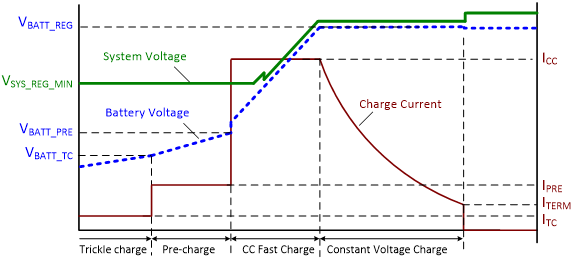 當(dāng)電池電壓比較低的時(shí)候,會(huì)把系統(tǒng)調(diào)節(jié)到最低的工作點(diǎn),然后使用Battery FET給電池進(jìn)行涓流/預(yù)充電,當(dāng)電池電壓高到一個(gè)閾值時(shí),會(huì)把電池和系統(tǒng)接在一起,進(jìn)行快速充電,電池充滿后,系統(tǒng)會(huì)再高一點(diǎn)點(diǎn),保證壓差。