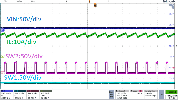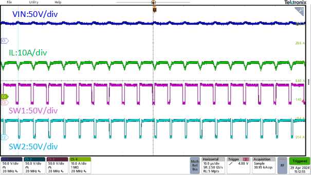 圖5. 800W, Vin=10~60V, Vout=20-55V滿電流條件下穩(wěn)態(tài)波形