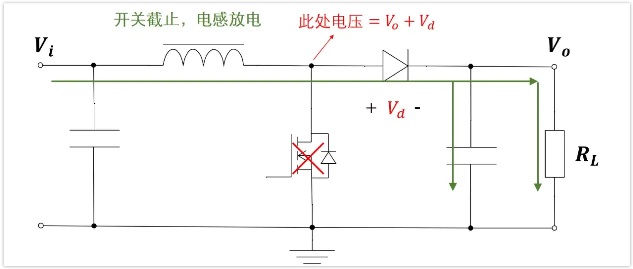 因?yàn)檫@是升壓boost電路,所以Vo+Vd會(huì)大于Vi,電感此時(shí)放電,給負(fù)載供電,并且給輸出濾波電容充電。