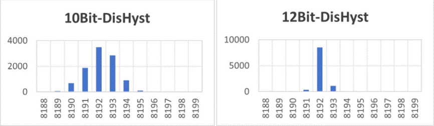 3、 角度精度碼分布集中,噪聲表現(xiàn)良好(10000次測(cè)量,數(shù)據(jù)分布,數(shù)據(jù)長(zhǎng)度均為16bit,圖上標(biāo)的bit數(shù)均對(duì)應(yīng)性能,相當(dāng)于enob)
