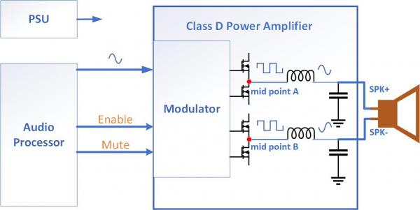 Class D功率放大器輸出與輸入音頻信號相對應的脈沖,A點和B點的脈沖由半橋開關產(chǎn)生。低通濾波器由電感和電容組成,為從這些高頻脈沖中解調出的音頻信號提供路徑,解調后的音頻信號通過揚聲器,將電能轉換為聲能,然后被人的耳朵聽到。如果用戶在開始播放音樂或計劃停止音樂時總是聽到爆裂聲或點擊聲,這將是非常糟糕的體驗。