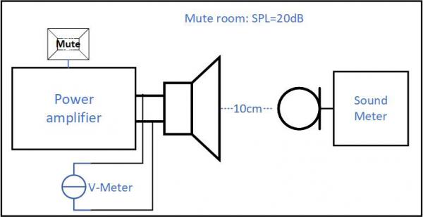 Figure 7 該平臺用于爆裂噪聲評估,V-Meter可以測量直流偏置電壓,Sound meter可以測量來自揚聲器的爆裂噪聲的聲壓。靜音按鈕用于將功率放大器從靜音切換到取消靜音或從取消靜音切換到靜音,Sound meter的麥克風傳感器與揚聲器在同一條線上,Sound meter將測量揚聲器的聲壓級。該平臺設置在靜音室中,然后分別進行有預補償和無預補償?shù)臏y試,數(shù)據(jù)列在以下表格中。