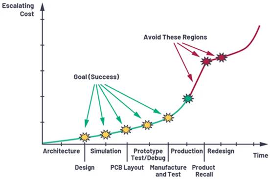 設(shè)計(jì)從圖紙上看起來可能毫無問題(也就是說,從原理圖角度),甚至在模擬期間也沒有任何問題,但真正的測試其實(shí)是在布局、PCB制造,以及通過載入電路實(shí)施原型制作應(yīng)力測試之后。這部分使用真實(shí)的設(shè)計(jì)示例,介紹一些技巧來幫助避開陷阱。我們將介紹幾個重要概念,以幫助避開設(shè)計(jì)缺陷和其他陷阱,以免未來需要重新設(shè)計(jì)和/或重新制作PCB。圖1顯示在沒有進(jìn)行細(xì)致測試和余量分析的情況下,在設(shè)計(jì)進(jìn)入生產(chǎn)之后會如何造成成本急速上漲。