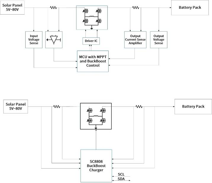 1.集成度高,控制實現(xiàn)簡單。SC8808 內(nèi)部集成升降壓控制和 MPPT 算法,還集成了 11 位高精度 ADC 用于電壓、電流和 NTC 熱敏電阻檢測電池組溫度檢測,外圍電路簡單,幫助工程師降低系統(tǒng)開發(fā)成本。