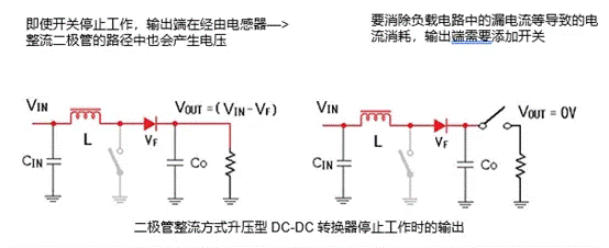 ・二極管整流升壓型DC-DC轉(zhuǎn)換器關(guān)斷時(shí),輸出不會(huì)變?yōu)?V,而是會(huì)輸出VIN-VF的電壓。