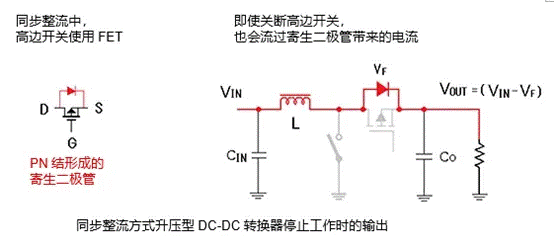 在同步整流的情況下,高邊開關(guān)使用的是FET,在關(guān)斷時(shí),高邊開關(guān)會(huì)因?yàn)闆]有柵極驅(qū)動(dòng)而處于OFF狀態(tài)。然而,F(xiàn)ET的寄生二極管會(huì)形成電流路徑,因此VOUT還是會(huì)輸出(VIN-VF)的電壓。