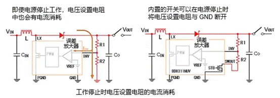 為了消除電壓設(shè)置電阻造成的電流消耗并減少待機(jī)消耗電流,一些電源產(chǎn)品會(huì)內(nèi)置可在關(guān)斷時(shí)將電壓設(shè)置電阻與GND斷開的開關(guān)。