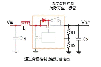 在IC中內(nèi)置有高邊開關(guān)FET的同步整流方式電源IC,有些產(chǎn)品具有向FET的背柵施加偏壓的電路,可通過控制該電路來消除寄生二極管。這個(gè)開關(guān)可以切斷FET的寄生二極管形成的電流路徑,因此在關(guān)斷時(shí)輸出電壓會(huì)變?yōu)?V,從而可以防止負(fù)載電路發(fā)生誤動(dòng)作,并確保電源復(fù)位,還能消除電壓設(shè)置電阻和負(fù)載電路導(dǎo)致的電流消耗(使該消耗電流為零)。