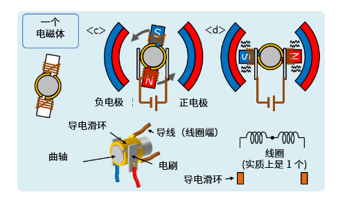 在“一個(gè)電磁體”圖中,有兩個(gè)電刷,一個(gè)接正電極,一個(gè)接負(fù)電極。如圖所示,當(dāng)用電刷夾住導(dǎo)電滑環(huán)時(shí),電壓會(huì)施加在與滑環(huán)相連的線圈上,從而使電流流過(guò)。該導(dǎo)電滑環(huán)安裝在電機(jī)的曲軸上,與線圈(電磁體)一起旋轉(zhuǎn)。