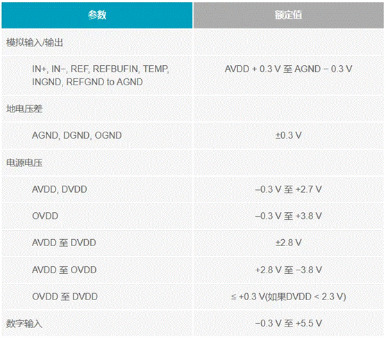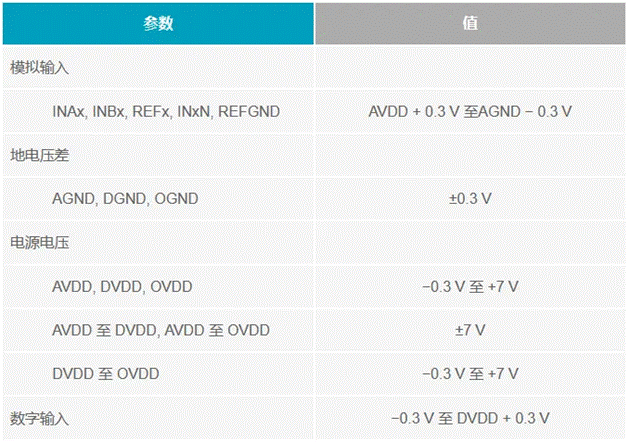 AD7794 Σ-Δ型24位ADC是另一個很好的例子。表3摘自AD7794 (Rev. D)數(shù)據(jù)手冊的“絕對最大額定值”部分。