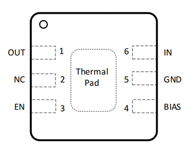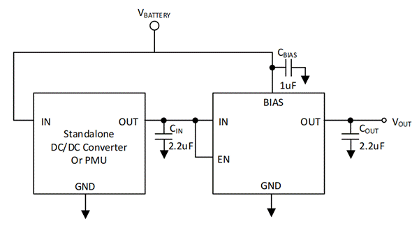 主電源路徑通過VIN,可連接至僅高于輸出電壓的值低至 150mV 的電源。該器件使用一個(gè)用于為 LDO 的內(nèi)部電路供電的附加 VBIAS 電源軌,支持極低的輸入電壓。IN 和 BIAS 引腳分別消耗 6.8µA 和 26µA 的極低靜態(tài)電流。低 靜態(tài)電流和超低壓差特性有助于提高功耗敏感型應(yīng)用中解決方案的效率。例如:IN 引腳的電源電壓可以是高效直流/直流降壓穩(wěn)壓器的輸出,而 BIAS 引腳電源電壓可以是可再充電電池。