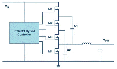 對于電荷泵,許多開發(fā)人員假定功率輸出限制約為100 mW。采用 LTC7821 的混合式轉(zhuǎn)換器開關(guān)設(shè)計的電路可以提供高達25 A的輸出電流。為了獲得更高的性能,多個LTC7821控制器可以連成并聯(lián)多相配置,并且頻率同步以分擔(dān)整體負載。