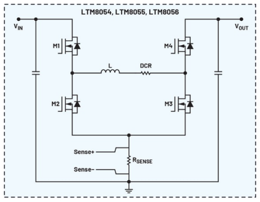 2023年,ADI發(fā)布了新款大電流、四開(kāi)關(guān)降壓-升壓穩(wěn)壓器LTM4712。這是一款36 VIN(最大值)、12 A功率模塊,采用高密度16 mm × 16 mm × 8.34 mm BGA封裝。它采用ADI專(zhuān)有的先進(jìn)組件封裝技術(shù),將高性能功率電感集成到封裝中。圖3顯示了該模塊中集成的專(zhuān)有電流檢測(cè)方案。這不僅節(jié)省了空間,而且還有效減少了額外的功率損耗。該器件采用先進(jìn)的降壓-升壓控制器和高級(jí)ADI封裝,能夠在寬輸入輸出電壓范圍內(nèi)實(shí)現(xiàn)超高的功率水平、功率密度、效率和出色的熱性能。