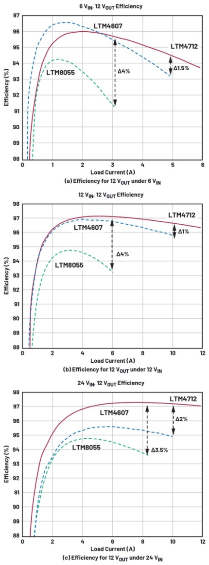圖4:LTM4712、LTM4607和LTM8055之間的效率比較