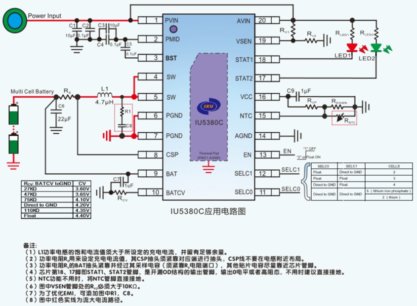 IU5380C具有完善的保護(hù)功能,包括輸入欠壓/過壓保護(hù)、電池過壓和短路保護(hù),電池溫度保護(hù)NTC功能、芯片過溫保護(hù)。此外芯片通過外接2路LED指示燈對(duì)充電過程實(shí)現(xiàn)全程監(jiān)控。