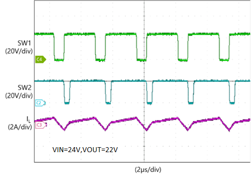 YX22105 能夠根據(jù)輸入輸出電壓自適應(yīng)的進(jìn)入降壓,升壓,升降壓模式;同時保證模式切換時具有優(yōu)異的暫態(tài)性能,使輸出的過沖、跌落風(fēng)險(xiǎn)降到最低。