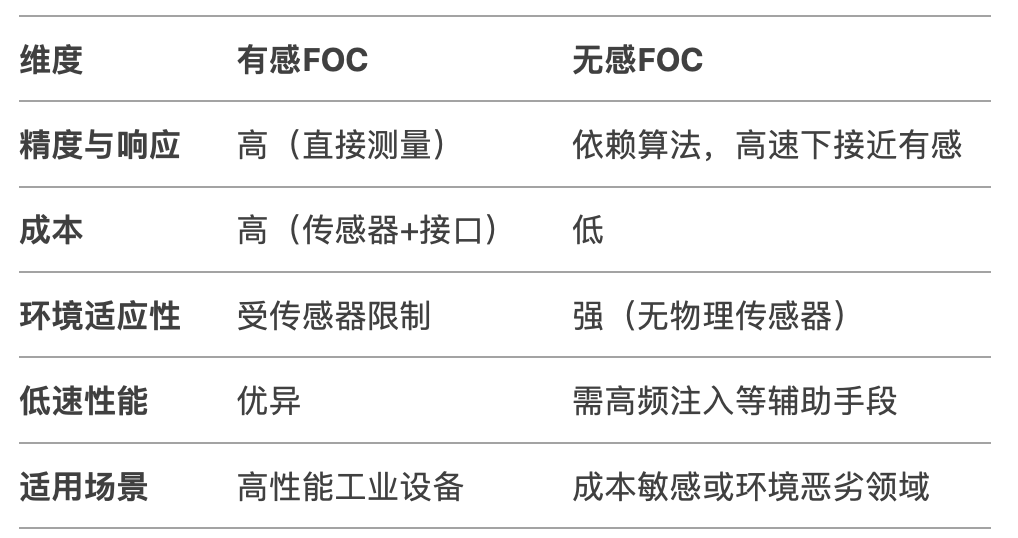 綜上所述,有感FOC和無感FOC之間的對比如下圖所示。