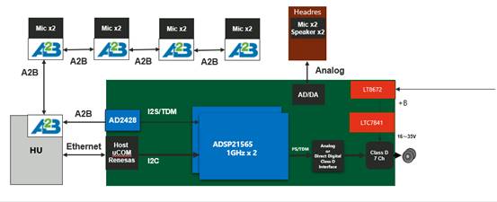 A2B是一種數(shù)字音頻傳輸方案,在音頻輸出輸入端只需要輸出I2S、TDM等這些數(shù)字音頻格式的音頻到A2B芯片,就能夠直接傳輸?shù)綄?duì)端,繼而對(duì)端的A2B接收器便可以實(shí)現(xiàn)解碼輸出。此方案能避免我們進(jìn)行本地?cái)?shù)模轉(zhuǎn)化和遠(yuǎn)端模數(shù)轉(zhuǎn)化的過程,從而減少音頻損失。在AD、DA的轉(zhuǎn)化過程中,不管位數(shù),采樣率做得多高,都會(huì)產(chǎn)生一定的音頻損失。