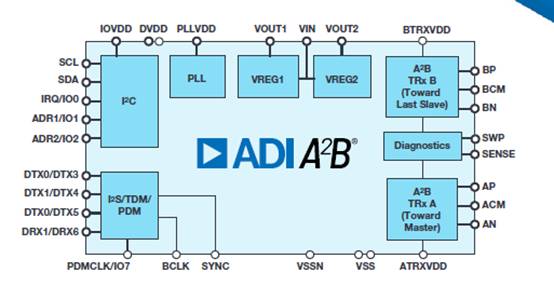 A2B內(nèi)部構(gòu)建塊,包括PLL、數(shù)字音頻接口、I2C接口、VREG、以及AB端的接收器與編解碼器: