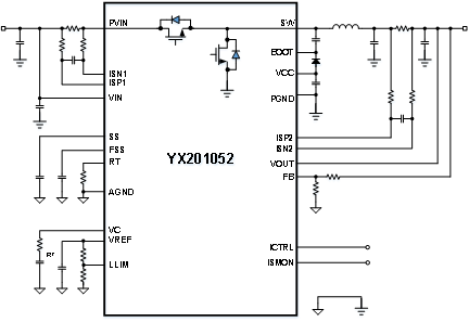 圖2 YX201052應(yīng)用框圖 (帶輸出恒流調(diào)節(jié)和監(jiān)測(cè))