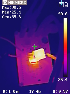 從熱成像圖可以看出,DEMO板在高負(fù)載條件下,溫度分布均勻,沒有局部過熱現(xiàn)象。在VIN = 64V, VOUT = 12V, IOUT = 5A 的條件下,最高溫度點(diǎn)為80.1℃,在 VIN = 80V, VOUT = 12V, IOUT = 5A 的條件下,最高溫度點(diǎn)為90.6℃。