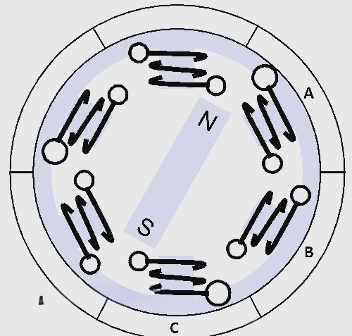 當(dāng)電流通過線圈時,會產(chǎn)生磁場,而磁力線的方向則取決于電流的方向。利用這一原理,如果給線圈A通入電流,它會產(chǎn)生磁場并吸引轉(zhuǎn)子磁鐵,使轉(zhuǎn)子磁鐵沿順時針方向略微偏移并與A對齊。接著,如果依次使電流流過線圈B和C,轉(zhuǎn)子磁體將連續(xù)沿順時針方向旋轉(zhuǎn)。