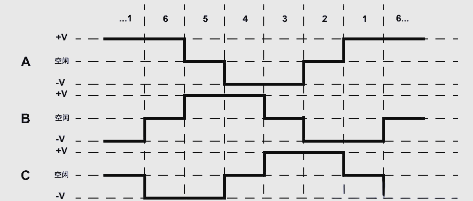 為了確保轉(zhuǎn)子磁鐵能夠完成完整的360度旋轉(zhuǎn),我們可以靈活運用線圈A、B和C的六種不同組合,這些組合在以下的時序圖中得到了清晰的展示。