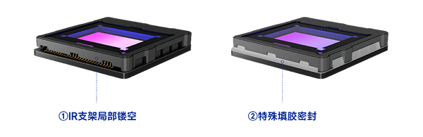 而TCOM在實現(xiàn)小型化設(shè)計的同時,兼具了性能和成本上的優(yōu)勢。首先,改善支架設(shè)計。在連接CIS與FPC電路板的金線兩側(cè),IR支架局部鏤空,寬度縮短約10%。然后采用獨特的填膠工藝和設(shè)備,在元器件放置兩側(cè)、IR支架與元器件之間,按一定角度完成填膠密封。