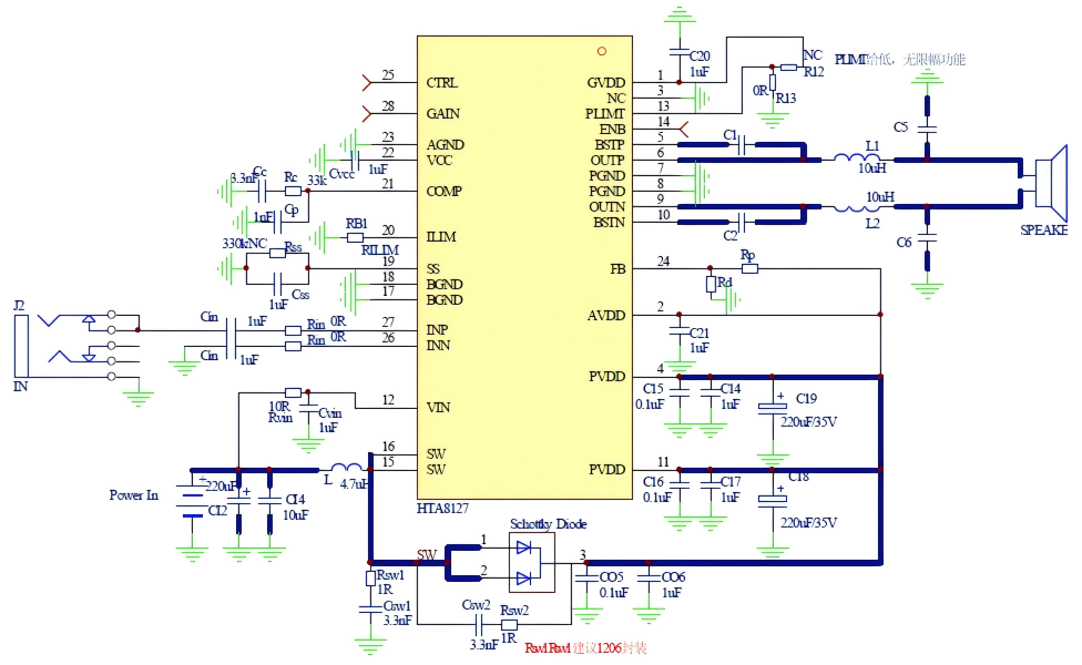 HTA8127是一款內(nèi)置升壓的單聲道D類音頻功放IC,其支持單節(jié)鋰電、雙節(jié)鋰電串聯(lián),5V、12V等多種輸入,升壓后的電壓提供給功放供電,功放支持單聲道BTL輸出。HTA8127內(nèi)部集成免濾波器調(diào)制技術(shù),能夠直接驅(qū)動(dòng)揚(yáng)聲器,內(nèi)置的關(guān)斷功能使待機(jī)電流最小化,還集成了升壓電壓過(guò)壓保護(hù)、輸入電源欠壓異常保護(hù)、輸出端過(guò)流保護(hù)、片內(nèi)過(guò)溫保護(hù)等功能。HTA8127內(nèi)置的升壓電路,可通過(guò)FB腳設(shè)置升壓值,以滿足不同的輸出功率需求。其還可通過(guò)外置電阻調(diào)節(jié)開(kāi)關(guān)峰值電流限值。