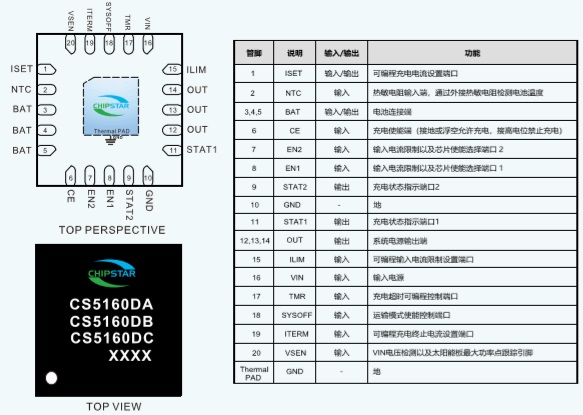 CS5160D是一款鋰離子電池線性充電器,適用于空間受限型便攜式應(yīng)用的系統(tǒng)電源路徑管理,兼顧多種類型太陽(yáng)能板充電及適配器輸入,支持1mA-1.5A的充電電流。USB輸入電流限制精度和啟動(dòng)序列使得這款芯片能夠符合USB-IF涌入電流規(guī)范。