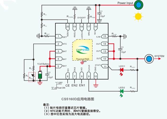 CS5160D具有完善的保護(hù)功能,包括輸入欠壓和過(guò)壓保護(hù)、輸出欠壓和過(guò)壓保護(hù)、芯片溫度調(diào)節(jié)和保護(hù),充電超時(shí)保護(hù)、電池過(guò)壓和短路保護(hù)、電池溫度保護(hù)。此外芯片通過(guò)外接的兩路LED指示燈,可對(duì)充電過(guò)程實(shí)現(xiàn)全程監(jiān)控。