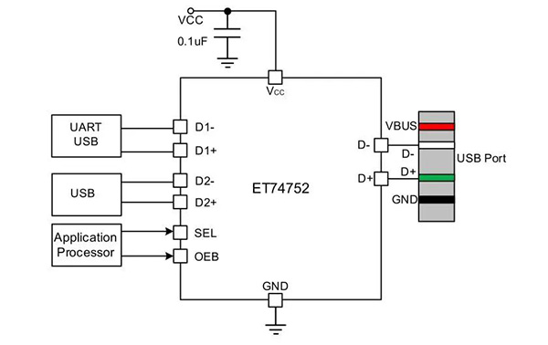 ET74752是力芯微推出的高性能DPDT USB 2.0開關(guān)芯片,集成過壓保護(hù)(OVP)和浪涌防護(hù)功能,專為智能設(shè)備接口安全設(shè)計(jì)。支持480Mbps高速傳輸,帶寬達(dá)1GHz(單端)。其核心優(yōu)勢(shì)在于多重保護(hù)機(jī)制:當(dāng)檢測到D+/D-引腳電壓超過5.1V時(shí),OVP功能自動(dòng)切斷通路,可耐受24V DC輸入;同時(shí)支持35V浪涌防護(hù),有效保護(hù)下游電路。