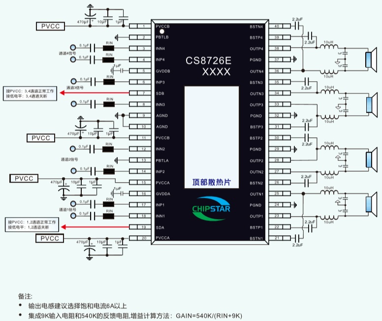 CS8726E內(nèi)置了過流保護(hù),短路保護(hù)和過熱保護(hù),有效的保護(hù)芯片在異常的工作條件下不被損壞。