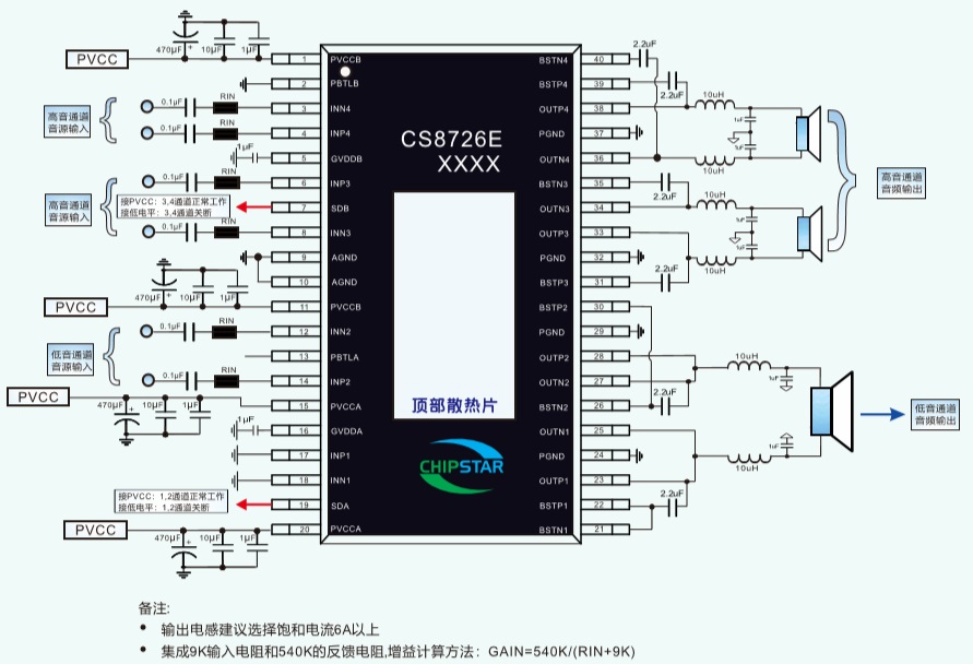 CS8726E是-款4X70W四通道D類音頻功率放大器,這款器件在頂層設(shè)計(jì)了散熱焊盤,焊盤上連接散熱器后在供電電壓24V的情況下,最大可以輸出4x70W的連續(xù)功率.