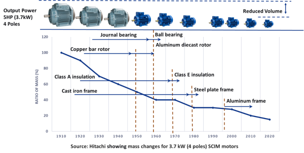 從滑動軸承到滾動軸承的轉(zhuǎn)型,對降低摩擦、提高精度從而提升電機(jī)效率起到了關(guān)鍵作用。過去一個世紀(jì)以來,電機(jī)在保持相同功率輸出的前提下實(shí)現(xiàn)了顯著小型化。以現(xiàn)代5馬力鼠籠式轉(zhuǎn)子三相感應(yīng)電機(jī)(SCIM)為例,其體積大幅縮小,重量僅為1910年同功率電機(jī)的20%左右。這種尺寸縮減得益于更輕量化高效材料的應(yīng)用,以及熱絕緣和電絕緣技術(shù)的進(jìn)步。更輕巧的電機(jī)對汽車應(yīng)用尤為有利——既可通過減重提升能效,又能將電機(jī)集成到更緊湊的空間。這些技術(shù)進(jìn)步的影響深遠(yuǎn),造就了能效更高、性能更優(yōu)且更節(jié)能的電機(jī)系統(tǒng)。