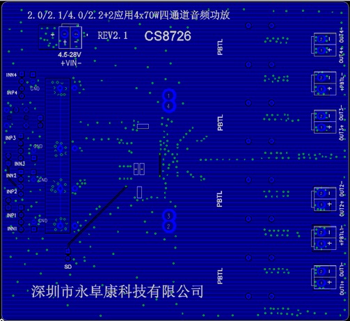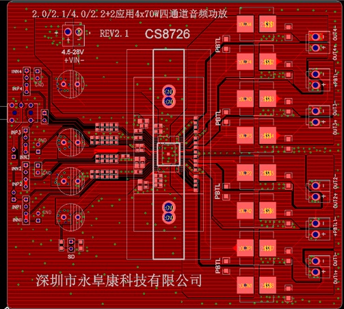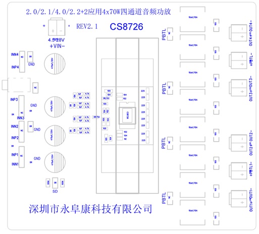 因此,為盡可能減少高性能多通道音頻系統(tǒng)的功耗和簡化相關的溫度管理,電子工程師一直希望借助高效率的多聲道D類功放芯片,來簡化應用線路,節(jié)省PCB面積。深圳市永阜康科技有限公司一直專注于音頻領域的耕耘,現(xiàn)在大力推廣一款4X70W四通道D類音頻功放IC-CS8726E,工作電壓4.5V-28V,兼顧2.0/2.1/4.0多聲道音頻應用,這款器件在頂層設計了散熱焊盤,焊盤上連接散熱器后在供電電壓24V的情況下,最大可以輸出4x70W的連續(xù)功率.提供了特殊的EFB40封裝形式供客戶選擇,合適的封裝尺寸為客戶安裝散熱器件提供了最大的方便,其額定的工作溫度范圍為-40℃至85℃。