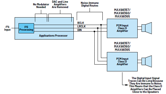 圖2.PCM輸入的數字D類放大器系統只需要使用三根連接線,而且處理器側不需要調制器或對數據進行上采樣。