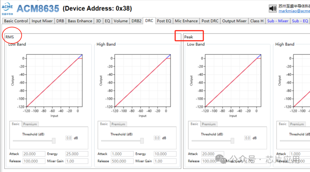 市面上的DRC都是基于RMS DRC技術(shù),RMS技術(shù)的不足之處在于需要相對較多的時(shí)間周期做檢測,在該時(shí)間內(nèi)信號的失真是難以避免的。而peak DRC技術(shù)能夠根據(jù)用戶設(shè)定的Level,在RMS DRC完全起作用前,抑制失真,起到相輔相成的效果。