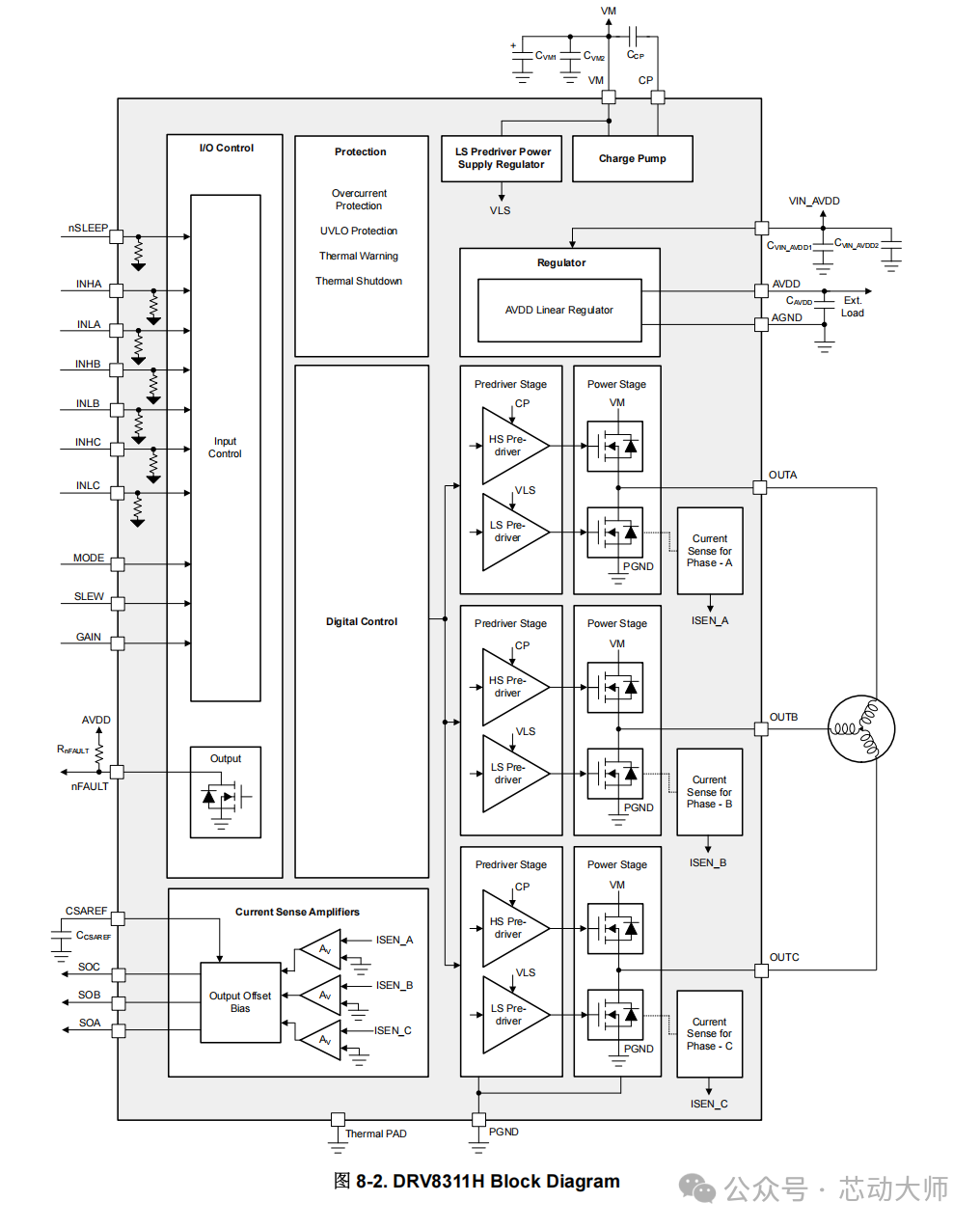 18V、3A三相無刷無感驅(qū)動、180˚正弦,集成驅(qū)動算法+預驅(qū)+MOS |