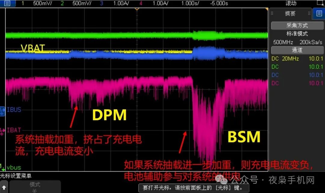 如下圖,為手機(jī)buck charge IC BSM模式的波形。IBAT為正表示進(jìn)電池電流(充電),負(fù)表示出電池電流(放電),我們能夠觀察到DPM和BSM的表現(xiàn)。