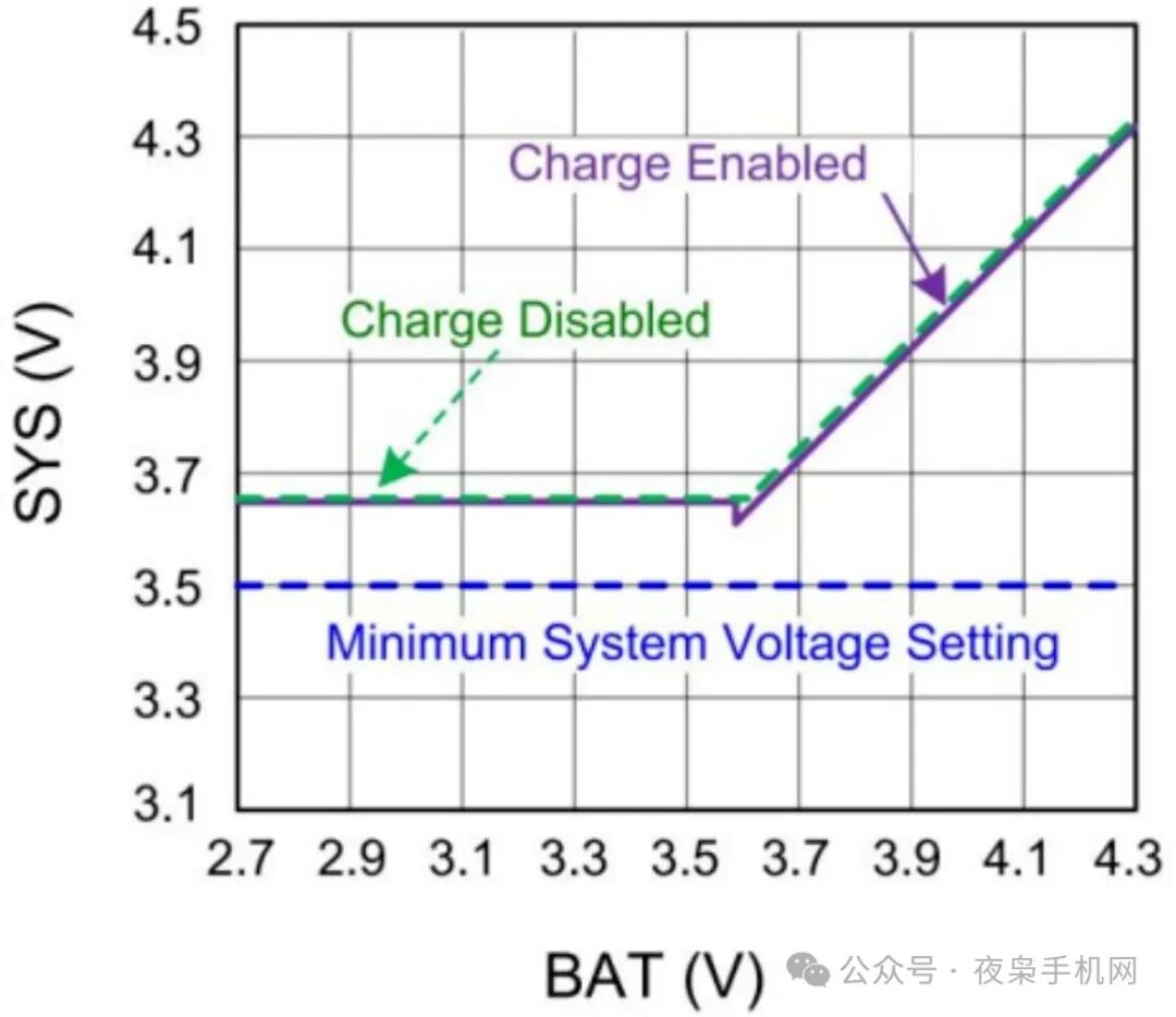 如下圖,如果VBAT低于設(shè)定的最小系統(tǒng)電壓時(shí),BATFET將會運(yùn)行在線性模式(LDO mode),此時(shí)充電IC輸出的Vsys電壓將會比設(shè)定的最小系統(tǒng)電壓高150mV;當(dāng)VBAT上升到比最小系統(tǒng)電壓高時(shí),BATFET將完全導(dǎo)通(full on mode),此時(shí)充電IC輸出的Vsys電壓被調(diào)節(jié)在比電池電壓高70mV左右的一個(gè)電壓。