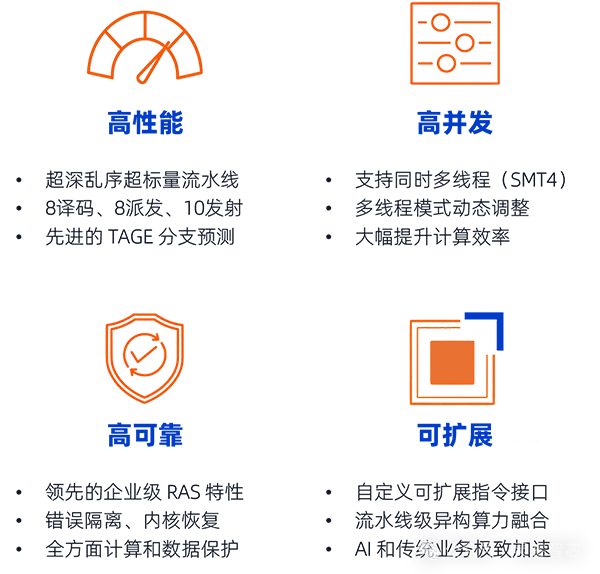 高并發(fā):P100是國內(nèi)唯一支持動態(tài)同時多線程(SMT)技術(shù)的CPU內(nèi)核,最高支持4線程,并可根據(jù)業(yè)務(wù)特性在SMT1、SMT2、SMT3和SMT4模式間動態(tài)靈活切換。這一設(shè)計極大提升了CPU內(nèi)核的線程級并發(fā)能力,顯著提升計算資源的利用率和面效(性能/面積),完美契合泛在智能時代以數(shù)據(jù)為中心的計算范式。