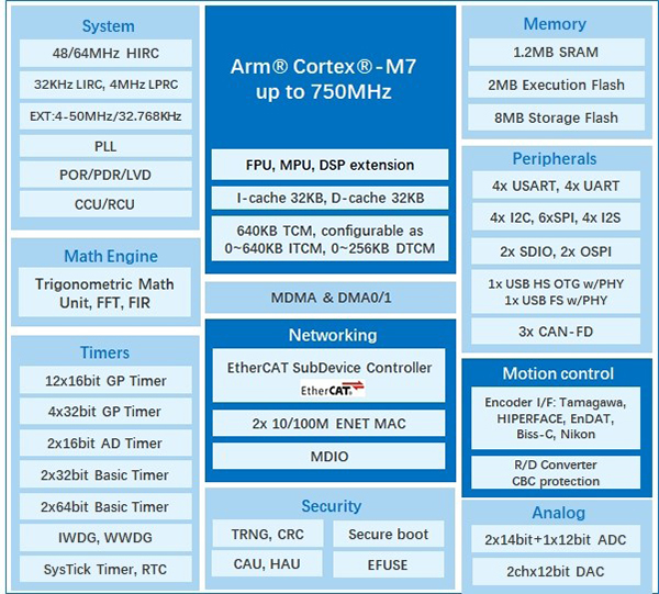 業(yè)界領先的半導體器件供應商兆易創(chuàng)新GigaDevice(股票代碼 603986.SH、3986.HK)今日宣布,正式推出新一代GD32H7系列超高性能MCU,包含GD32H789/779系列超高性能通用MCU,以及集成EtherCAT®從站控制器GD32H78E/77E超高實時性系列MCU,該系列產(chǎn)品基于Arm® Cortex®-M7內(nèi)核,主頻高達750MHz,配備高速大容量內(nèi)存架構及640KB可與CPU同頻運行緊耦合內(nèi)存(TCM),實現(xiàn)了高性能、低動態(tài)功耗與高速通信的有機統(tǒng)一。該系列微控制器可適用伺服控制、變頻驅動、數(shù)字電源、便攜電子產(chǎn)品,智能家居以及消防等領域,樹立性能新標桿,為下一代智能裝備的升級奠定核心硬件基礎。