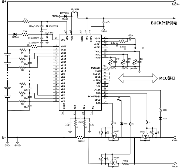 內(nèi)部集成了高精度信號采集轉(zhuǎn)換、全功能保護硬件狀態(tài)機、高耐壓低功耗電源轉(zhuǎn)換,無需外部MCU 和電源轉(zhuǎn)換芯片配合,就可獨立監(jiān)測和保護鋰電池包,也可配合外部 MCU 對鋰電池包監(jiān)測,同時實現(xiàn)軟件保護及電量計算,從而增加系統(tǒng)設計的冗余,進一步增強保護可靠性。