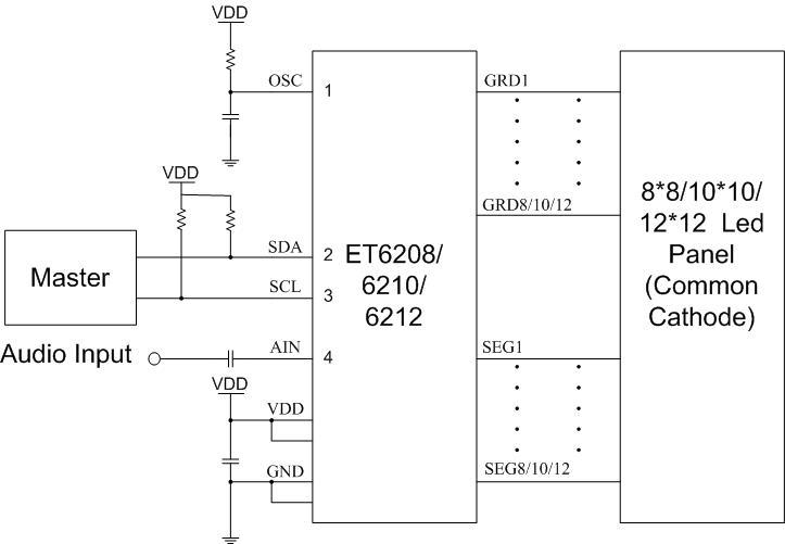 ET6208/6210/6212是一顆單片集成音頻7段圖形均衡器并可驅動8*8(ET6208),10*10(ET6210),12*12(ET6212)點陣的LED驅動電路。ET6208/6210/6212有音頻同步模式和普通模式兩種工作模式。在音頻同步模式下,通過內置帶通濾波器把20Hz~20KHz的輸入音源信號細分為7個頻段,再通過內置的高精度ADC把每個不同頻段的平均幅度值轉換成對應的數(shù)字值,同時計算出音源信號的總平均幅度值,最后送到輸出顯示。在音頻同步模式下MCU無須進行任何數(shù)據(jù)操作,只需要設置相應的指令,LED燈就可以隨著輸入音源的頻率以及強弱同步顯示7路對應頻率的幅度,和1路總音量強弱顯示。在普通模式下,可以實現(xiàn)1/8(ET6208),1/10(ET6210),1/12(ET6212)占空比的動態(tài)LED顯示,內置128階的亮度等級可以幫助用戶實現(xiàn)更多彩的圖案,同時還內置了7個時間等級的自動呼吸功能。256*8bit(ET6208),256*10bit(ET6210),256*12bit(ET6212)的RAM,可以任意設置顯示RAM的首地址、顯示長度及RAM的顯示周期數(shù),在不過多占用系統(tǒng)資源的前提下大幅度增加了用戶的可編程性。工作電壓2.7V-5.5V
