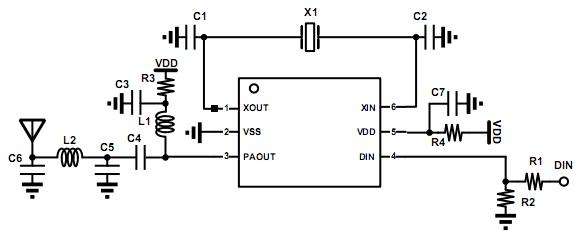 • 基于 PLL 鎖相環(huán)的發(fā)射器,頻率范圍為:250MHz 到 450MHz • 片上單穩(wěn)態(tài)電路