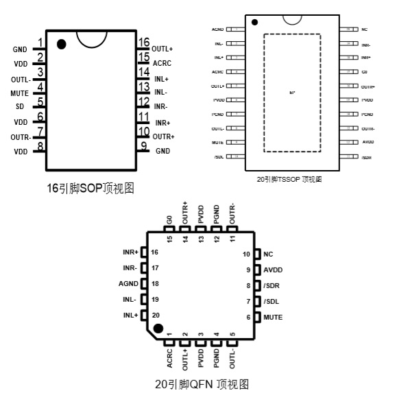2×20W (VDD=14.5V, RL=4Ω, THD+N=1%) 或2×25W (VDD=14.5V, RL=4Ω, THD+N=10%) |
