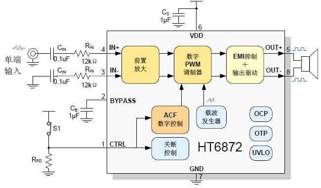 HT6872的最大特點是防削頂失真(ACF)輸出控制功能,可檢測并抑制由于輸入音樂、語音信號幅度過大所引起的輸出信號削頂失真(破音),也能自適應(yīng)地防止在電池應(yīng)用中由電源電壓下降所造成的輸出削頂,顯著提高音質(zhì),創(chuàng)造非常舒適的聽音享受,并保護揚聲器免受過載損壞。同時芯片具有ACF-Off模式。