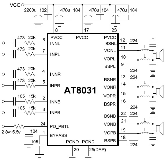擴(kuò)頻技術(shù),固定40倍增益,差分輸入,2X15W+30W 2.1聲道專用D類音頻功放 |